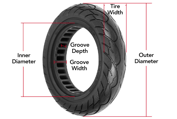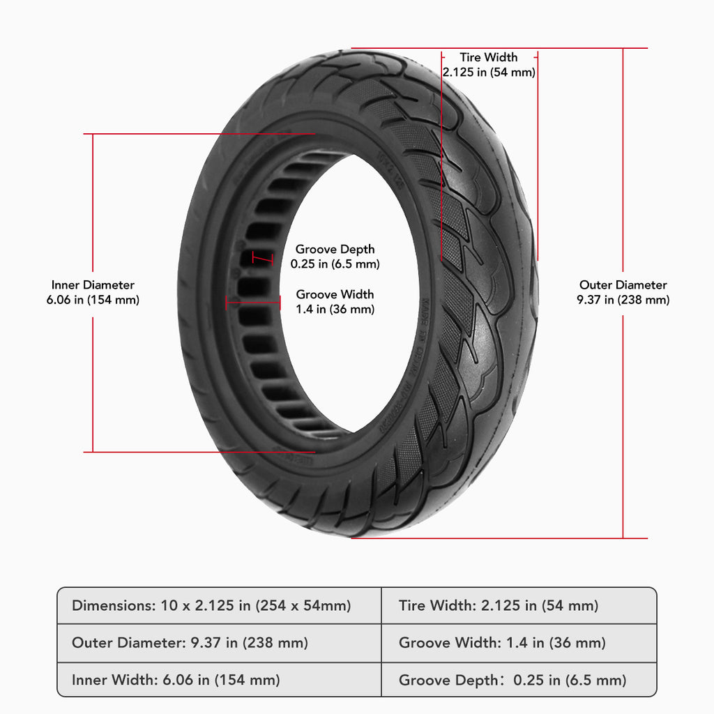 Dimensions 10 x 2.125 in (254 x 54mm) Outer Diameter 9.37 in (238 mm) Inner Diameter 6.06 in (154 mm) Tire Width 2.125 in (54 mm) Groove Width 1.4 in (36 mm) Groove Depth 0.25 in (6.5 mm)